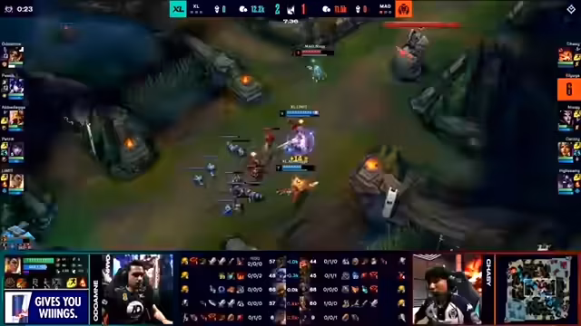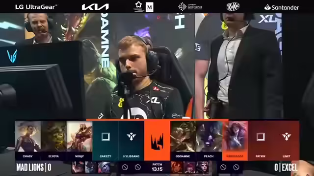 01:40:17Nach dem ersten Spiel zeigen beide Teams Anpassungen im Draft. XL blieb bei eher standardmäßigen Picks während Mad Lions offensiver agierte. Der Fokus lag auf der Kontrolle von Seitenlinien und dem späten Spiel. Die Kalista-Pick von XL wurde im Nachhinein als problematisch angesehen, da sie sich nicht in das Teamkonzept einfügte und kaum Schaden verursachte. Mad Lions nutzte diese Schwäche aus und fokussierte sich auf das Wegnehmen des Main-Damage-Dealers von XL.