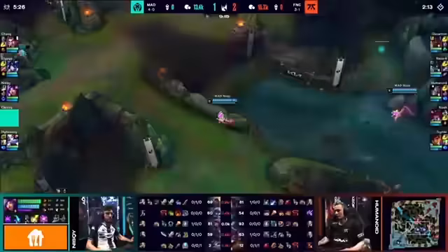 05:26:13Der Fokus liegt auf den早期的 Spielphasen und der Jungle-Pathing. Der Elyoya-Jungler von Mad Lions zeigt aggressives Verhalten, indem er sofort den Buff nimmt und auf die Top-Seite rotiert, um Oskar in der Lane zu unterstützen. Dies führt zu ersten Spannungen in der Bot-Lane und bei der Drakon-Controle. Oskar auf der Top-Lane für Fnatic agiert dominant und sichert sich eine gute Gold- und CS-Vorschrift, was ihm einen frühen Kill gegen Nisqy beschert und den ersten Drachen für sein Team sichert.