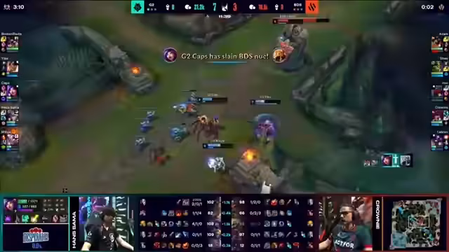 02:18:20Caps versucht einen Flank, der aber fehlschlägt. BDS hat die Kontrolle über das Spiel. Der nächste Drake ist die Soul für Team BDS. Sie nutzen den Nashor, um die Lanes zu pushen. Caps wird angegangen und stirbt. Yike versucht, Crowny zu erreichen, scheitert aber. Team BDS sichert sich die Soul und gewinnt den Fight. Nach 26 Minuten steht es 1:1. Niemand hat mit diesem Ergebnis gerechnet. Das zweite Spiel war genauso deutlich wie das erste, nur eben für BDS. Es wird spekuliert, ob es am Blueside-Buff oder an Hochmut von G2 lag. Die Evelynn war nicht erfolgreich. Es wird vermutet, dass G2 einen klugen Plan mit Evelynn hatte, der aber nicht aufging. Das Spiel ging verloren, als Yike in Adam gefacecheckt hat. G2 hat das Spiel verloren. Es folgt eine kurze Pause vor dem dritten Spiel. Team BDS zieht das Spiel in die Länge. G2 sah alt aus. Es wird erwartet, dass G2 die nächsten beiden Spiele gewinnt, aber der Sieg von BDS soll nicht aberkennen werden. BDS hat das Spiel sehr sauber gespielt und im Early Game die Botlane dominiert. Crownly war gut geschützt, was die Win-Condition von Team BDS war. Die Evelynn war nie involviert, was das Problem war. BDS hat früh getrackt, wo sich Evelynn aufhält. Yike konnte sich nicht einmischen, weil die Lanes bereits eskaliert waren. Die Sololanes und die Botlane von Team BDS konnten mithalten. Crownie auf Seri funktioniert gut. Die Kombo von BDS war stimmiger als die von G2. Braum anstatt Lulu war der Unterschied. G2 muss adaptieren, damit das dritte Spiel nicht aus den Händen gleitet.