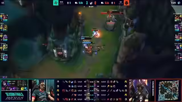01:01:11Das erste Spiel zwischen G2 Esports und Team BDS beginnt. Der Druck auf beide Teams wird betont, da der Gewinner nicht nur im Upper-Bracket-Finale der Season Finals steht, sondern auch sicher zu den Worlds fährt. Die Teamzusammensetzungen werden analysiert, wobei BDS auf zwei AD-Carries (Kaiser und Seri) und zwei beschützende Supports (Lulu und Aiwan) setzt, während Adam auf Renekton spielt. G2s Plan ist es, das Early-Game zu beruhigen, damit Seri ihre Items sammeln kann. Das Top-Lane-Matchup zwischen Broken Blade und Adam wird als besonders interessant hervorgehoben, da ihre Spielstile sehr unterschiedlich sind. Die ersten Spielzüge werden beschrieben, darunter ein Flash-Engage in der Mid-Lane und ein aggressiver Spielstil von G2 auf der Bot-Lane. G2 zieht viele Flashes von BDS, was für Rell von Vorteil ist. Yike unterstützt Broken Blade auf der Top-Lane, was zu Adams Flash führt. G2 sichert sich den ersten Drake, obwohl Adam runtergeschiftet ist, was den Favoritenstatus von G2 unterstreicht.