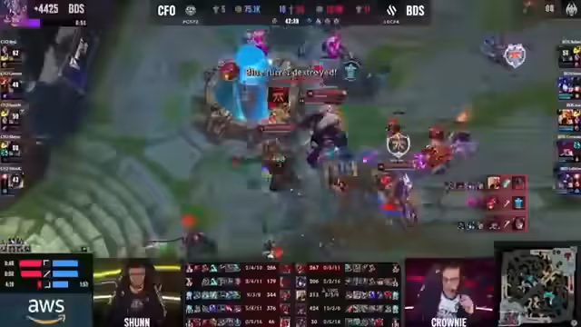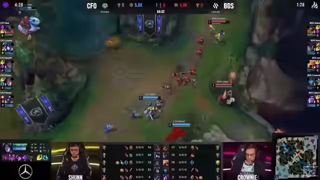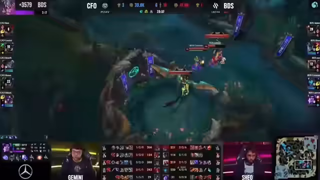 03:40:18Ein entscheidender Fight am Drachen eskaliert. Trotz des Soul-Points für Flying Oysters kann BDS mit proaktivem Play, getragen von der starken Performance von Nuk und Crowny, den Fight für sich entscheiden. Das Team erringt einen Double Kill und kehrt das Spielgedreht. Der Baron Nashor sichert ihnen einen erheblichen Gold-Vorteil und eine dominante Position.