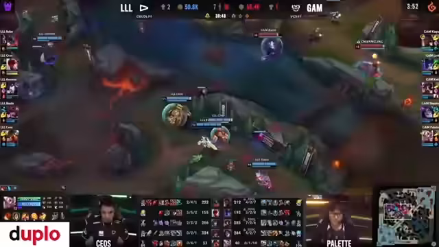 00:33:20Mit einem Goldvorteil und starkem Scaling beginnt GAM, das Spiel zu dominieren. Die Fokus auf Cassiopeia, der fast unbesiegbar ist, kombiniert mit der Nocturne-Initiative von Levi, zwingt Laut in eine passive Position. GAM gewinnt Teamfights entscheidend, verdoppelt ihren Goldvorsprung und nutzt den Herald, um in die Mid-Lane zu drängen und den Druck aufrechtzuerhalten.