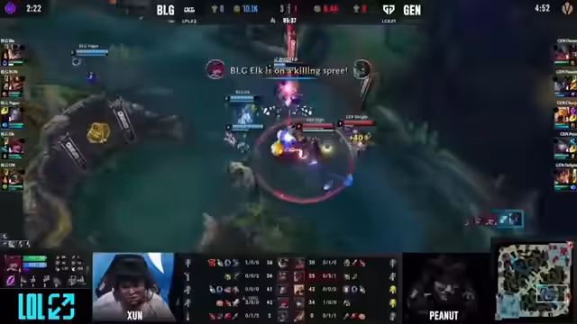 03:58:15BLG will den Nashor, aber Schobi nutzt Stopwatch. Yagao timed seinen Poplossen nicht optimal. Schobi kauft Raum und Elk muss sofort flashen. Gen.G hat mehr Kontrolle und ein gutes Decision-Making. Yagao will seine Ult auf Shovies Stopwatch-Time, schafft es aber nicht. BLG kann Gen.G nicht catchen. Gen.G hat einen kleinen Vorteil und einen Shouvi, der in Fahrt kommt. Pace will und bekommt einen Double Kill. Gen.G holt sich dieses Game, entscheidet sich aber für den Nashor anstatt für den Finish Run. Gen.G geht auf Nummer sicher, da ein Finish Run zu viel Tempoverzug gehabt hätte. Tahm Kench frisst Ash, aber Jovi kommt von der Seite und macht einen Double Kill auf Rumble. Pace rettet den Nashor und holt sich den Kill. Gen.G ackert hart für das 2 gegen 2. Elk bekommt einen 800 Gold Shutdown gegen Peanut.