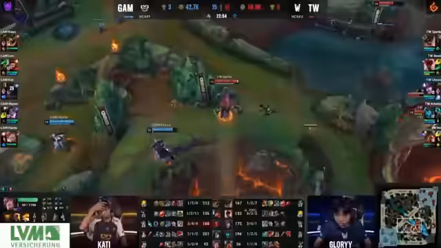 02:38:48Ein wilder Kampf entbrennt, aber Glory sichert sich Slayder, opfert sich aber fast selbst gegen Kati's Jace. Ohne die Xayah kann Team Wales den Nashor nicht mitnehmen, was das Spiel für sie hätte beenden können. Sparda kann nicht wie gewünscht tanken, und Kati kann immer wieder Shock Blasts einsetzen. Slayder bereitet den Kill vor, opfert aber sein Leben. Ohne Jungler hat Team Wales keine Chance, viel auszurichten. Kati snipt immer wieder und ist sehr stark. GAM liegt knapp 2k Gold vorne, aber das ist noch kein großes Problem. Glory spielt sehr gut, aber es wird für ihn schwierig, in die Kämpfe zu kommen. Artemis wird von GAM gefangen, was ein Todesurteil für den nächsten Kampf sein könnte. GAM holt Slader ab, damit er in der Mitte nicht gefangen wird, und geht mit fünf Mann auf den Nashor. Kati will das verhindern, und GAM sichert sich immerhin einen Drachen. Artemis macht einen fatalen Fehler, der das Spiel entscheiden könnte. GAM hat sich zurückgekämpft und ist nun mit dem Baron Buff gesegnet. Es sah gut aus für Team Wales, aber GAM ist stärker. Slayder tanzt Team Wales aus und sichert sich Türme. Slayder's Positionierung ist hervorragend, und er kann ohne Bedrohung Schaden verursachen. Wer sich bis zur 20. Minute deutlich absetzen kann, gewinnt das Spiel. GAM muss Slayder isolieren und kontrollieren. Der große Kampf beginnt, aber Slayder positioniert sich perfekt. Artemis lässt sich klatschen, was fatal ist. GAM sichert sich die Ocean Soul und baut einen 6.000er Goldvorsprung auf. Der Jax erweist sich als stark in den Teamfights. GAM spielt perfekt und sichert sich den Sieg. Team Wales' Serie ist gebrochen, und GAM steht mit 2-1 am Matchport. Individuelle Fehler von Team Wales und die Item-Spikes von Kati tragen zum Sieg von GAM bei. Kiaya und Slider müssen hervorgehoben werden, während Kati's Schockblas den Schaden vorbereiten.