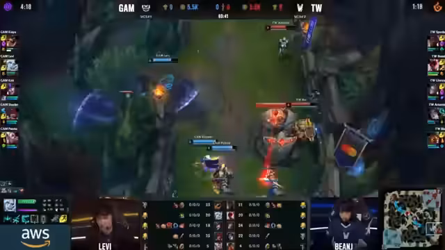 01:52:49Team Wales spielt sehr stark und verhindert, dass GAM die Souls bekommt. Immer mehr Türme fallen durch das Baron Play. Team Wales nutzt die Wall zur Separation und will die Basis endgültig aufknacken. Wales zieht sich zurück und nimmt das Play nochmal mit. In zweieinhalb Minuten ist der Baron wieder auf der Karte. GAM hat keinen Raum mehr für Fehler, da drei Inhibitoren zerstört werden könnten, was zu permanenten Super Minions in der Basis führen würde. Team Wales hat einen über 10.000 Gold Vorteil und die Soul. Team Wales erzwingt einen Engage und bestraft GAM für proaktives Spiel. Team Wales gewinnt Game 2 dominant und gleicht die Series aus. B&J und B zeigen Charakter und erholen sich von den Nerven in Game 1. Levi erhält Raptors-Verbot.