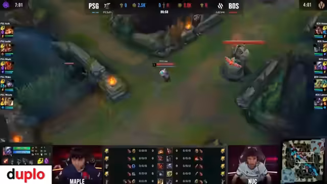 08:25:35BDS startet den Nashor, während PSG einen Double Teleport investiert. Adam von BDS ist wieder im Spiel und Lavrov wird geblockt. Der Nashor geht an BDS, aber sie können keinen Knock-Up erzielen. Junjia von PSG lauert und Azzi von BDS erzielt einen Mega-Knock-Up. Adam wird ausgeschaltet, aber der Rest von BDS lebt noch. Azzi sucht die nächsten Ziele und Junjia ist auf der Jagd. Lavrov wird ebenfalls ausgeschaltet. BDS hat nur Botwaves und muss diese rausschieben. Crowny räumt die Wave weg, aber die anderen Spieler sind bald wieder da. Mit der Wave können sie das Spiel nicht beenden. PSG ist gut im Drücker, aber ein Finish-Run ist nicht möglich. Maple von PSG steht mittlerweile 4-0-4. BDS gewinnt Distanz und zieht sich zurück. Sie haben Nashor anvisiert, aber das Blutrick hat sie verraten. Der Nashor wird nicht besonders verwertet. Das Spiel ist weiterhin offen und ein Nervenkrimi. GA bei Crowny ist da. Ein einziger Teamfight könnte das Spiel entscheiden. Die Soul ist nicht so wichtig wie der Kampf um die Soul selbst. Double Teleport ist bereit bei PSG.