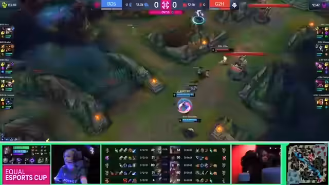00:47:11In der frühen Phase des Spiels gelang es G2, einen Vorteil zu erlangen, obwohl BDS zunächst eine schnelle Eliminierung auf der Columbus-Position erreichte. Keltus und China überlebten jedoch, und Ender wurde von China ausgeschaltet. Trotz anfänglicher Schwierigkeiten für Keltus und Mana-Probleme für Eva Luna, konnte Virgo mit ihren Resets und einem Double Kill glänzen. BDS hätte im frühen Spielverlauf verhindern müssen, dass Viego Kills erzielt, da dies seine Skalierung begünstigte. BDS' Top-Lane mit Renga sah weiterhin gut aus, solange sie keine Turmschüsse abbekamen. Ein aggressiver Flash von Cedar trug ebenfalls zum anfänglichen Vorteil von BDS bei. G2 sicherte sich die Krabbe und positionierte sich für den Drachen, wobei BDS versuchte, mit ihrer Early-Game-Combo entgegenzuwirken. In einem Teamfight opferte BDS viel, um die Supporterin auszuschalten, aber Lysia war kurz davor, Mega-Gnar zu werden. Evaluna ging mit einem Flash rein, und Ender wurde erneut von Keltis erwischt, während Schia mit Viego glänzte und einen Double Kill erzielte, was G2 den Fight gewann. BDS verbrauchte viele Ultimates, während G2 um den Drachen herumtanzte.