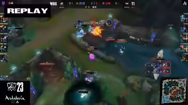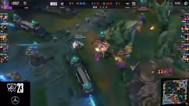 02:40:26T1 kontrolliert das Spiel von Anfang an und sichert sich beide Herald-Drakes. Sie besitzen einen Goldvorsprung von etwa 1000 und pressurieren den gegnerischen Mid-Laner Faker. Trotzdem fehlt Vision, was Weibo zu einem schnellen Drake-Takeover verhilft. T1s Investment in den Drake ist hoch und die Situation bleibt für beide Seiten sehr spannend, da T1 den nächsten Fight suchen und die Karte für sich entscheiden will.