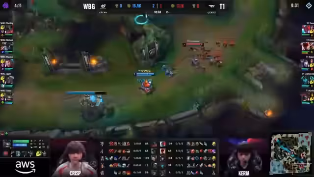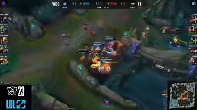 01:59:15Zeus dominiert das Spiel auf der Top-Lane und führt T1 zu einem deutlichen Goldvorteil. In der Bot-Lane hat Gumayushi 4000 Gold mehr als Light, was für Weibo extrem unangenehm ist. T1s strategische Fokus liegt darauf, den Jungler Carrier aus dem Spiel zu halten, während die Senner von Weibo nervige Druckmomente aufbauen. Faker agiert wie der Kapitän und wartet in der Flanke auf seine Chancen für seinen vierten World-Titel.