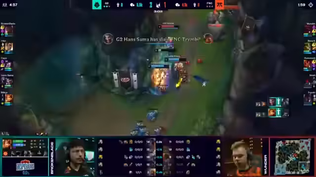 01:13:57Das Spiel beginnt sofort mit hohem Tempo und aggressiven Bewegungen auf der Map. G2 setzt Fnatic unter Druck, indem sie topsewards visioniert und einen Fang für den gegnerischen Jungle Jaik planen. MickyX, der Top-Laner von Fnatic, wird isoliert und fällt in einen von G2 gelegten Hinterhalt. Es folgt ein 3-2 Gang, der in einem Desaster für Fnatic endet, mit zwei Kill für G2 und einem schweren Start für Jaik.