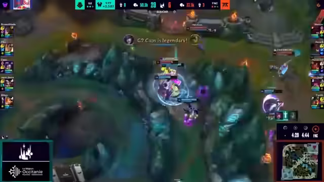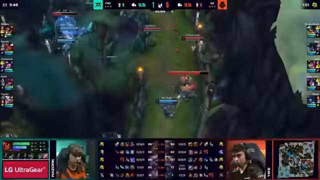 01:37:57G2 nutzt ihre immense Goldvorteile, um das Spiel zu ihren Gunsten zu entscheiden. Sie sichern sich den Nashor und rollen über die Bot-Lane, um den ersten Inhibitor zu zerstören. Die Drakes als neutrale Objekte werden als irrelevant eingestuft, da das Tempo des Spiels bereits festgelegt ist. Trotz einzelner Fightversuche von Fnatic, wie einem Teleport-Play von Humanoid, ist G2 in der Lage, jeden Kampf für sich zu entscheiden. Der letzte, entscheidende Teamfight führt zum Gewinn des Spiels für G2 mit einem Stand von 1:0.