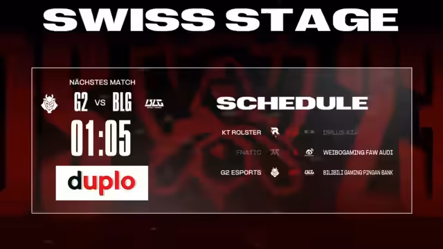 09:05:58Der letzte Tag der Swiss Stage beginnt mit drei aufregenden Best-of-Threes. Zuerst treten KT Rolster gegen Dplus Kia an, ein koreanisches Duell, das für beide Teams existenziell ist. Danach steht das Match zwischen Fnatic und Weibo Gaming auf dem Programm, das als schwieriges Los für das EU-Team gilt. Den Abschluss bildet das Spiel G2 Esports gegen BLG, das extrem spannend sein dürfte. Diese Spiele entscheiden über das Weiterkommen in die Playoffs, wobei KT gegen Dplus als das ausgeglichenste Duell gilt.