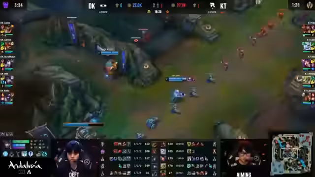 01:55:15Im Mid Game intensivieren sich die Teamfights, wobei KT seinen Goldvorteil nutzt. KT kontrolliert das Spiel durch gut platzierte Teamfights und Objektive, während DK kämpft, zurückzukommen. Kommentare zeigen, wie KT's zusammenspiel, insbesondere zwischen den Lanes, effektiv ist. DK kämpft jedoch hart, um ins Spiel zurückzufinden.