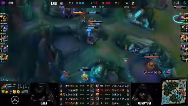 01:02:08Das erste Game gestaltet sich zu einem klaren Vorteil für T1. Nach dem frühen First Blood für LNG durch eine aggressive Top-Lane-Initiative, kann T1 dank besserem Team-Koordination, insbesondere durch Fakers Shockwave, den Skirmish für sich entscheiden. T1 sichert sich den ersten Herald und baut einen anhaltenden Vorteil auf allen Lanes aus. Die Disziplin und die kühle Abgebrühtheit von T1 im Kontrast zu unkoordinierten Aktionen von LNG werden als entscheidend für die ersten Spielminuten bewertet.