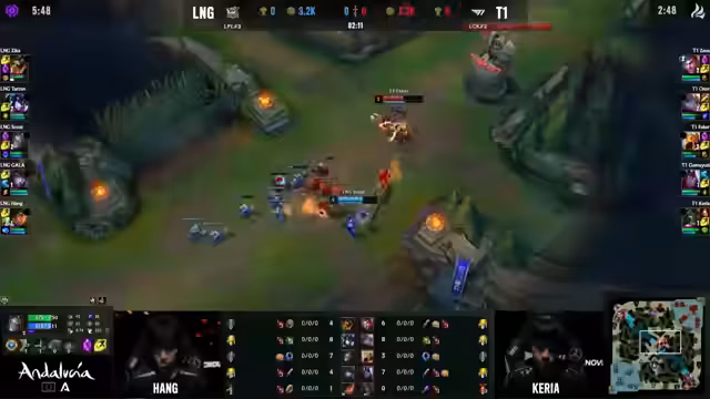 02:02:35Ein konzentrierter Teamfight entbrennt um die Cloud Soul. Tarzan greift für den ersten Fight an, Zeus ist im Fokus und sehr low. Faker kann nicht sofort reagieren und muss den Reset abwarten. In der Zwischenzeit engagiert sich auch Sicker, die Situation für T1 wird unübersichtlich. Der Fight ist unkoordiniert und voller Fehler. Für T1 ist es ein knapper, aber wichtiger Sieg, der den Lead weiter ausbaut und die Moral bei LNG bricht.