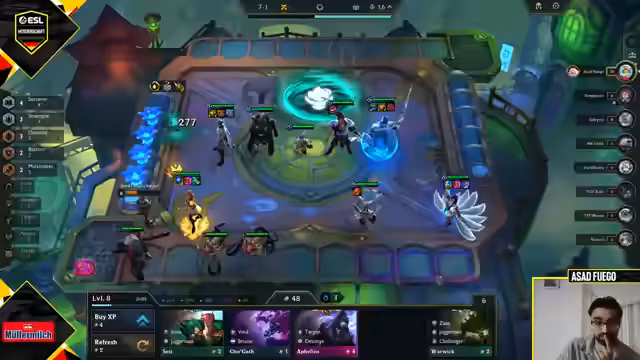 00:13:17Im weiteren Verlauf des Streams kommt es zu spannenden Kämpfen und schwierigen Platzierungsentscheidungen. Narkes wechselt in Richtung Invoker-Komp statt zur erwarteten Sorcerer-Comp, was die Analysten überrascht. Die Spieler stehen vor Herausforderungen bei der Item-Verteilung und Positionierung. Asad zeigt eine beeindruckende Performance mit einem unbesiegbaren Darius und ebenfalls starker Samira, während Sasa mit Scrappy Invention eine innovative Strategie verfolgt und erfolgreich bleibt.