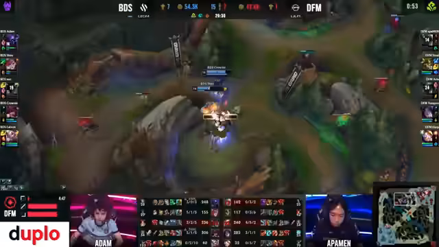 02:24:02Trotz der anfänglich unkonventionellen Picks etabliert Team früh im Spiel die Kontrolle. Der Jungle von BDS, Steel, zeigt eine exzellente Map-Presence und sichert wichtige Ressourcen für sein Team. Währenddessen agiert das gesamte Team sehr synchron, führt Objektive sicher durch und isoliert den gegnerischen AD-Carry. DFM wirkt dagegen passiv und kann kaum in das Spiel eingreifen, was zu einem klaren und unaufhaltsamen Sieg von BDS führt.