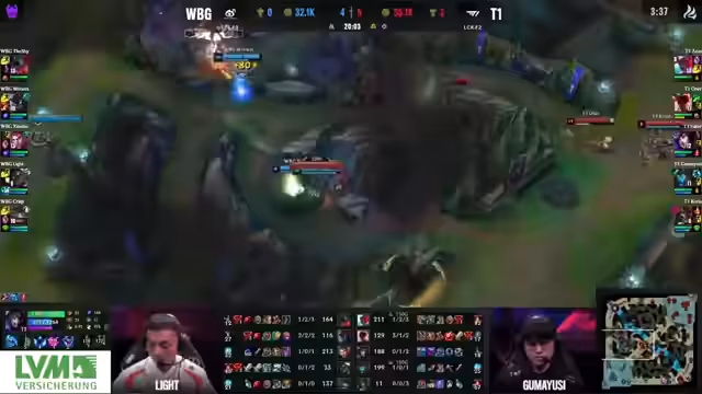 02:09:13T1 sichert sich zwei Kills, während Weiwei tot ist. Weibo Gaming versucht, mit dem Harald Druck aufzubauen. Weiwei tankt viel Schaden und dreht den Kampf um. Crisp rettet Faker vor Light. T1 hat bisher eine Objective-Quote von 100%. Seos wird gesmitet, und T1 sichert sich den Harald. T1 will in den Reset gehen, hat aber nicht gleichzeitig die Zeit. Weibo Gaming konzentriert sich auf Kills statt auf Objectives. Der Harald wird in der Mid-Lane eingesetzt. Der Gold-Lead von T1 wird wieder kleiner. Schau hat das Jumus ready. T1 versucht, über die Mid-Lane in den River zu gelangen. Weibo Gaming hat zu viel Poke und Schaden. Guma Yushi kann seinen Carrier noch mal reinholen. Faker muss den Spirit Rush verwenden. Weibo Gaming hat eine bessere Drake-Position. Ouna geht für den Enziger auf Schauhu, der flasht raus. Faker setzt den Flasch hinterher, geht daneben, und Schauhu überlebt. T1 lässt sich am Drake verputzen. Shaohu kommt mit dem Leben davon, aber er bringt eine Nachricht an die LPL. T1 ist online. Ouna findet einen guten Kick. Weibo Gaming bekommt den Drachen, aber T1 sichert sich das lokale Gold und die Türme. T1 hat einen Gold-Power-Play von 3000 Gold mehr nach 20 Minuten.