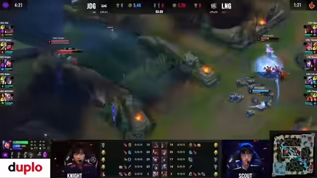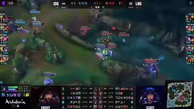 02:42:51JDG startet einen koordinierten Flash-Engage, um das Spiel zu drehen. Knight und Missing zielen dabei auf den LNG-Carry Gala ab. Obwohl JDG den Teamfight zu gewinnen scheint, schafft LNG es, den Schaden zu minimieren und sogar einen Kill für sich zu beanspruchen. Das Spiel bleibt nach dieser Aktion auf Augenhöhe, was dieMapView zeigt.