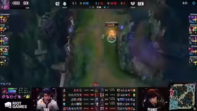 04:12:52Das zweite Spiel zwischen G2 und Gen.G wird als Schlüsselmatch angesehen, um den Einzug in die nächste Runde zu sichern. G2 soll als First Seed aus der LEC nicht mehr mithalten können, sondern als dritte Kraft agieren und Gen.G nur noch einen Sieg davon trennt, als zweites Team aus der LPL in die nächste Runde einzuziehen. Das Spiel könnte eine Wiederholung der Rivalität zwischen Jankos und Peanut bedeuten, die im World Final kulminieren könnte.