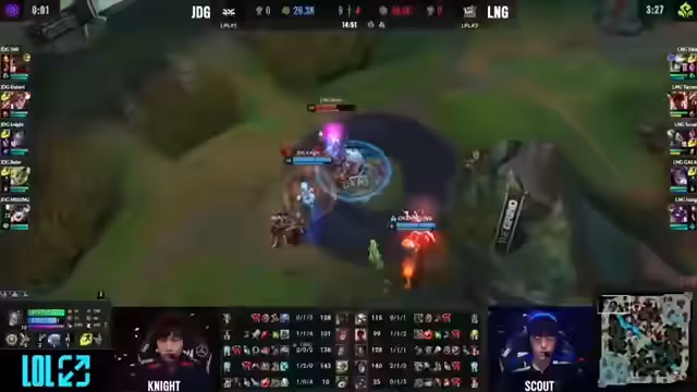 02:50:22In einem entscheidenden Teamfight glänzt der Support Missing von JDG. Er findet mit seinem Rakan den perfekten Grand Entrance und charmt mehrere Gegner, was die Initialzündung für den Fight von JDG ist. JDG kann den Kampf mit 2:0 gewinnen und den Drachen sichern. LNG muss disengagen und verliert damit massiv an Momentum.