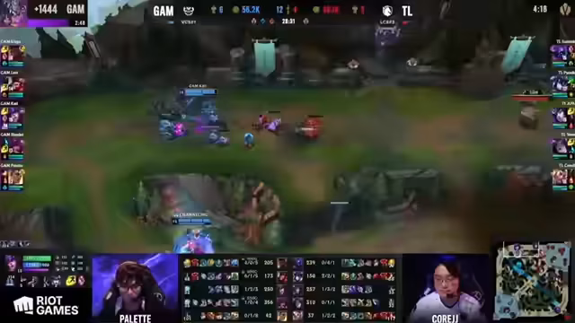00:54:37Das Early Game beginnt mit dem Fokus auf den Top-Lane Match-up zwischen Rumble und Irelia sowie der Bot-Lane zwischen Tristana und Ori. GAM hat auf dem Papier eine bessere Startposition, doch Team Liquid übt früh Druck aus. Ein Fehler von GAMs Top-Laner Summit führt dazu, dass Team Liquid den ersten Blood holt und so das Momentum des Spiels übernimmt, entgegen der vorherigen Erwartungen.