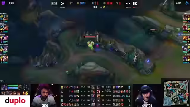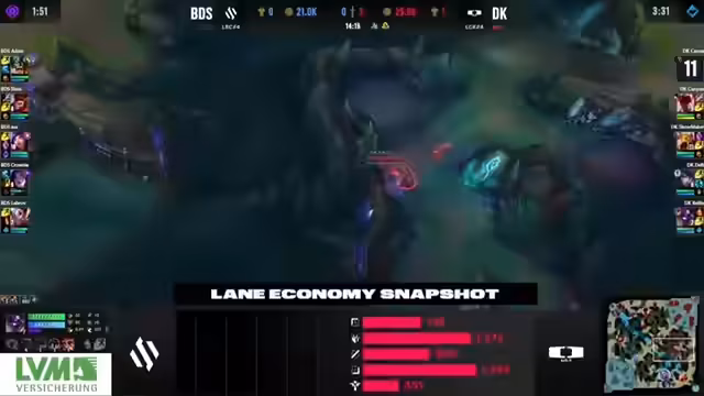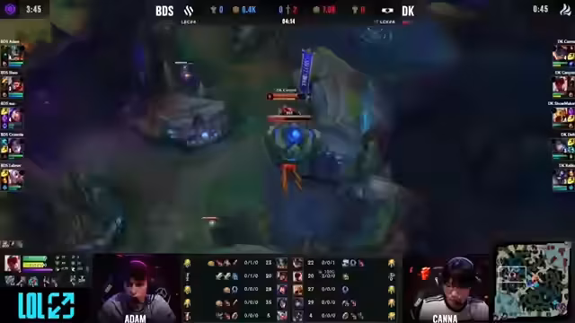 03:37:23Das Spiel beginnt für BDS problematisch. Adam auf Volibear wird früh von Kanna auf Rumble solokilled, was mental eine große Belastung für das Team darstellt. Auch die Bot-Lane mit Caitlyn und Blitzcrank kann keinen entscheidenden landen und verliert an Präsenz. DPlus Kia kontrolliert das Spiel, holt Kills und erarbeitet sich einen signifikanten Goldvorsprung von über 7000 Gold, während sich BDS hinten hält.