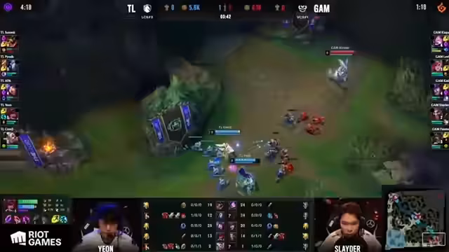 01:13:38GAM catched Top-Lainer und Ardicary und der Nash ist live. Team Liquid lässt sich die ganze Zeit engagen. GAM zwingt ihnen ihren Stempel auf. GAM bekommt Nasher for free und der Gold-Vorsprung explodiert auf 6000 Gold. Yon wird von Mahokai angeflasht. GAM kämpft meistens in mehrere Flanken rein. Mit 6.000 Gold Vorsprung hat GAM keine Drakes, aber die Brieftasche ist prall gefüllt. Katti macht einen Auto-Attack und hätte jetzt zwei Sekunden warten müssen und jetzt noch einen weiteren Demolish-Brock gehabt, um diesen Turm zu attacken. Beide Kerry sterben und GAM überfährt Team Liquid in diesem Team frei. Team Liquid hat keine Comeback-Chance mehr. GAM holt sich Game 1 gegen Team Liquid. Levi hat alle Engages gefunden, die er brauchte und das Team nach vorne zu bringen. Es war immer die Maokai Ults die jetzt im Schuss Johan vorbereitet haben. Levi ist der MB. Team Liquid ist ein Game davon entfernt, aus den Worlds auszuschalten.