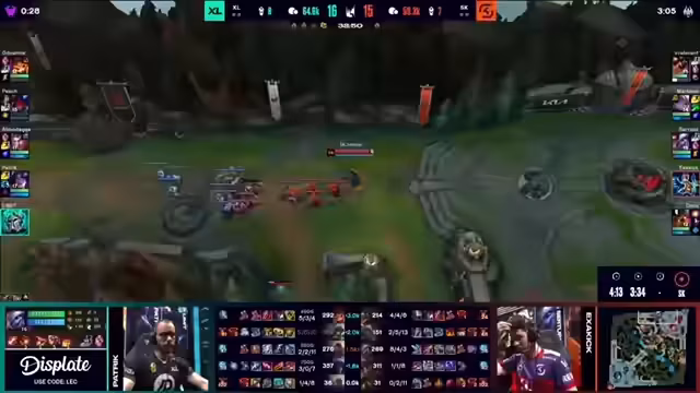 03:28:08SK zwingt immer wieder Fights, kann diese aber nicht für sich entscheiden. Sie bekommen nie wirklich Zugriff auf die Ashe, was XLs Spielplan begünstigt. Nach einem chaotischen Fight am Nexus, bei dem XL besser positioniert war, platzt der erste Nexus-Turm. Der zweite Nexus-Turm platzt kurz darauf, wodurch der Nexus frei liegt. XL schafft es, das Finish zu landen und das Spiel für sich zu entscheiden und zieht somit in die Playoffs ein.