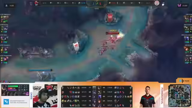 01:57:53Ein Schlüsselmoment ist ein komplexer Teamfight, in dem Power of Evil zunächst als einziger Überlebender seines Teams in eine 1-gegen-3-Situation gedrängt wird. Er nutzt diese Lage geschickt aus, um seinen ultimativen Schaden auszuschöpfen und das gesamte gegnerische Team auszulöschen. Diese außergewöhnliche Leistung demonstriert sein hohes Skill-Level und gibt seinem Team den entscheidenden Vorteil.