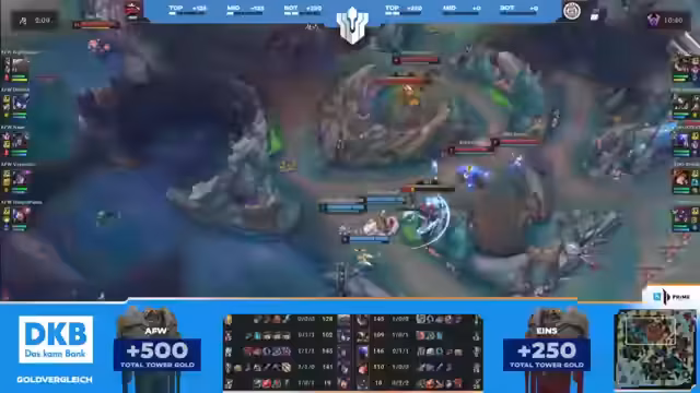 00:46:26Eintracht Spandau startet stark, der Early-Game-Duo Power of Evil (Akali) und Santorin dominiert die Midlane. Durch aggressive Ganks und gute Positionierung sichert sich Spandau einen erheblichen Goldvorsprung. Der Fokus liegt auf dem Contesten des ersten Drachen, den Spandau für sich entscheidet. Ein schwerer Kampf am Dragon endet mit einem klaren Sieg für Spandau (4:2 Kills), der den Grundstein für einen sicheren Sieg und das Ausscheiden von AFW aus den Playoff-Bestrebungen legt.
