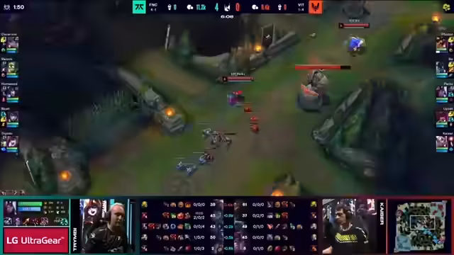 05:42:16Ein langes, ruhiges Spiel wird durch einen entscheidenden Fehltritt von Vitality beendet. Vitality overcommitet und riskiert einen Fight, den sie nicht gewinnen können. Fnatic nutzt dies und lockt Vitality in eine perfekt platzierte Falle. Mit einer Kombination aus Amumu- und Poppy-Ultimate werden die Carries von Vitality eliminiert, was es Fnatic ermöglicht, den Baron sicher zu nehmen und in die Basis von Vitality einzubrechen. Dieser Play markiert den Wendepunkt des Spiels.