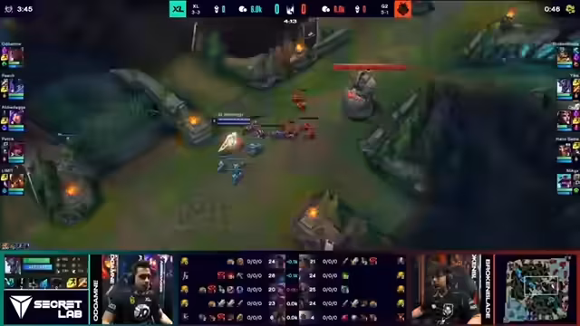 03:18:44G2 tradet defensiv in der Botlane, da sie Nocturn hinter Limit vermuten. Hans Summer und Mickie ziehen Half-Life ab, ohne sich zu sehr zu exponieren. Excel zeigt Verzweiflung und versucht, den Level-6-Spike von Doktoren auszunutzen. G2 ist sich des Level-6-Spikes bewusst und spielt vorsichtig. Yike holt sich den Herald und räumt den Bluebuff ab. G2 zeigt solides Gameplay. Limit wird in der Botlane gedeifet, wobei Hans Summer stirbt. Patrick nimmt einen Kill mit raus, was wichtiges Gold für XL bedeutet. G2 war überkonfident und hat überstürzt gedeifet. Han Summer nimmt Trinity aus der Situation mit. XL spielt die Dives gut aus, aber G2 macht auch Fehler. Hans-Nama Straven ist nur 1000 Gold vorne. G2 weiß, dass sich Nocturne in der Nähe befinden muss. Trundle covert das Ganze und nimmt den Herod mit. G2 nimmt die Vorteile mit, die sie im Early-Game nach vorne bringen. Der Gold liegt auf über 3000 Gold hoch. XL setzt alles auf eine Karte, aber Micky wird vom Blade Call mitgenommen. Das Investment von XL ist sehr groß für den Einen Kill. G2 kann weiterhin machen, was sie wollen. XL wollte unbedingt den Raven haben, am Ende haben sie Bruce and Brom bekommen, aber immerhin etwas. Gletscherspalte getimt auf den CNC. Der Gold-Lead ist weiter angewachsen. Es sieht immer schlechter aus mit jeder Minute für XL.