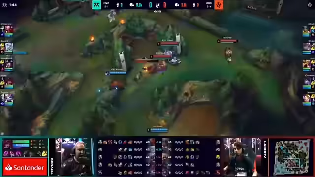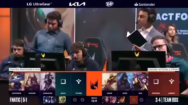 04:36:52BDS wird für einen missglückten Recall bestraft, was Fnatic einen Turm einbringt. Humanoid von Fnatic stirbt nach einem aggressiven Vorstoß, bei dem er fälschlicherweise annahm, seine Ult bereit zu haben. Labrov von BDS versucht einen Hook, verfehlt aber. Fnatic sichert sich den Elder Drake und den Baron, was jedoch nicht ausreicht, um das Spiel zu entscheiden. BDS pusht die Waves heraus. Ein Hook von Labrov verfehlt knapp und hätte das Spiel entscheiden können. Fnatic vermeidet es, in den Elder Drake zu kämpfen und konzentriert sich stattdessen auf das Pushen der Sidelanes. Ein weiterer Hook von Labrov geht daneben. Fnatic knackt die Base von BDS, nachdem der Elder Drake ausgelaufen ist. Ein Barrel von OscarRin zwang Olaf zur Ult. Noah von Fnatic wird für seine Performance gelobt, während Labrovs Hooks weiterhin unzuverlässig sind. Noah stirbt, nachdem er von einem Hook getroffen wurde. Fnatic gewinnt einen Teamfight und damit das Spiel, trotz zweifachen Elder Drakes für BDS. Humanoid erhält Catches im Late-Game. Fnatic war über weite Strecken das bessere Team, hat es aber unnötig spannend gemacht.