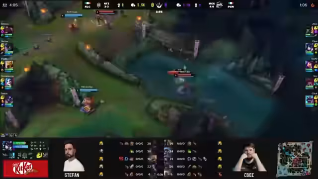 00:40:50Gegen alle Erwartungen dominieren Matschko das Early Game. Obwohl KC als stärkeres Early-Game-Team gilt, spielt der italienische Meister sehr aggressiv und koordiniert. Der Jungler Seaboy konzentriert sich auf die Bot-Lane, um dem Jinx-Carry Wizz einen Vorteil zu verschaffen. Nach einem erfolgreichen Trade und einem gezielten Plating-Gewinn nehmen Matschko die Kontrolle über das Spiel. Die konstante Druckausübung und die koordinierten Bewegungen auf der Map verhindern, dass sein eigener Counterpart bei KC ähnlich agieren kann und sorgen für einen überraschenden Goldvorteil für das italienische Team.