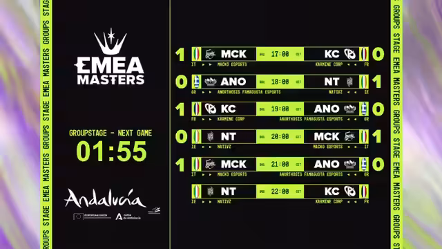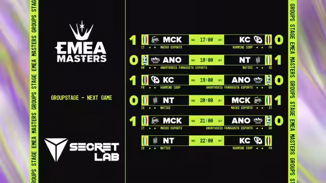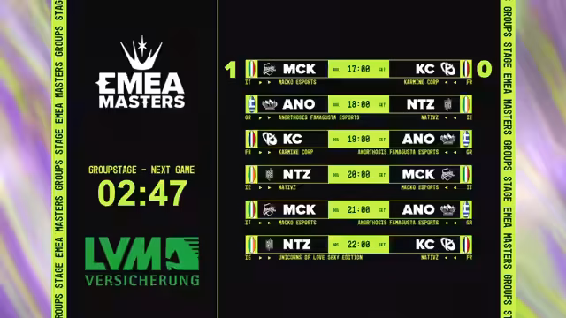 00:26:29Der Stream begrüßt die Zuschauer zum dritten Tag der EMEA Masters Group Stage. Heute liegt der Fokus ausschließlich auf Gruppe C, nachdem die Prime-League-Teams parallel gespielt haben. Besonderes Augenmerk liegt auf dem italienischen Meister Macau, der sensationell 3-0 startete und den französischen Meister KC bezwang. Die Kommentatoren sind gespannt, ob Macau auch das Rückspiel gegen KC für sich entscheiden und die Gruppe 6-0 beenden kann. KC gilt jedoch als Favorit, da sie eines der dominantesten Early-Game-Teams und französischer Meister sind. Auch Natives und Anotosis Famagusta werden als potenzielle Überraschungen in dieser als sehr stark bewerteten Gruppe erwähnt.