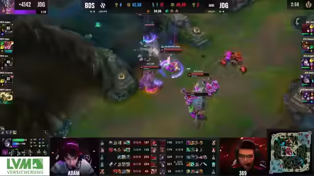 04:35:06Es besteht die Angst, dass bei längerem Spielverlauf das Kite-Potenzial von JDG durch deren CC zu groß wird. BDS führt zwar Gold, doch das Spiel wirkt noch nicht entschieden. Die Eröffnung des Herald beschäftigt beide Teams, da JDG mit dem Toplaner unten geht, was die Situation kompliziert macht. Garen scheint mehr Wert für das Team zu haben als der Herald, daher wird der Drake gedroppt.