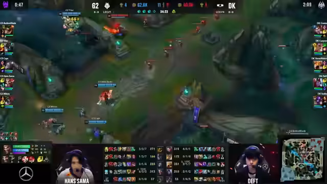 05:49:31G2 hat die Ocean Soul, aber das Spiel ist in der 34. Minute noch nicht entschieden. Jeder Fehler kann das Spiel entscheiden. Wer den Baron bekommt, sollte auch den Elder sichern. G2 nimmt das Momentum wieder auf und versucht, mit Türmen rauszudrücken. Broken Blade wartet in der Flanke und wird vom Team separiert. G2 rettet Broken Blade und sichert sich den Nashor. Showmaker könnte ein Play machen. G2 gibt Fersengeld und muss fighten, da D-Plus die beste Position hat. Das könnte das Spiel entscheiden. G2 muss den Elder aufgeben. Das ist ein großes Risiko mit Showmakers Scaling. G2 geht gemeinsam zum Elder und gleicht frühere Fehler aus. Eine Shockwave könnte ein Play machen. Broken Blade teleportiert hinter die Gegner. Canyon flasht auf die andere Seite der Wand. Es kommt kein Teamfight zustande. Mickiex und Caps müssen auf Showmaker aufpassen. Canyon trifft nur Canyon. Was für ein Thriller dieses Game ist!