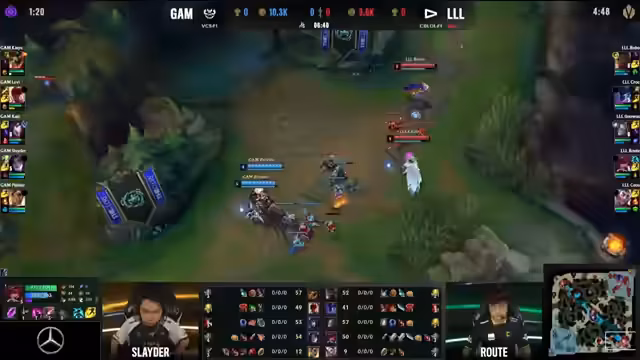 01:20:41Das Spiel zwischen Loud und GAM beginnt mit einem frühen First Blood für Zeus von Loud. Loud zeigt eine überraschend starke Leistung gegen den Favoriten GAM. Es wird diskutiert, dass alle Teams, die an diesem Tag spielen, auch am MSI teilgenommen haben. Ein frühes Aufeinandertreffen auf der Botlane führt zu einem Kill für Loud. Krog von Loud versucht einen Gank auf der Botlane, aber ein Ward verhindert den Erfolg. Ein Dive auf der Toplane führt zu einem Kill für GAM, aber Loud kontert mit einem Kill auf der Botlane. Die Renektons in den bisherigen Spielen haben Schwierigkeiten. Loud gewinnt einen Vorteil von 1000 Gold. Rout von Loud erzielt einen Kill mit einem Q-Shot und Void Seeker. Loud überrascht mit einem starken Early-Game und stellt GAM vor Probleme. Der Fokus von Loud liegt auf der Botlane, während GAM sich auf die Topside konzentriert. Loud erzielt weitere Kills und baut seinen Vorsprung aus. Die Kommentatoren loben Louds Leistung und betonen die Überraschung angesichts der Favoritenrolle von GAM. Es wird erwähnt, dass Tinnons den Ghost-Item spielt.