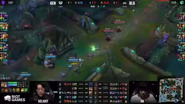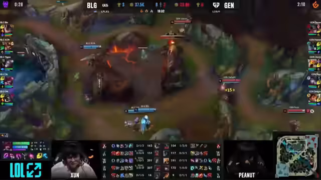 03:21:18Tsun initiiert einen Bot Lane Invade und sichert sich den gegnerischen Bot Lane Jungle, während Peanut im Topside Jungle agiert. Gen.G wird in der Bot-Lane komplett überrannt, da sie Probleme haben. Der Teleport wird abgebrochen. D-Light hat seinen W-Skill auf Cooldown. Doran versucht einen Teleport gegen Cassante. Der Solo-Kill von Bin auf Doran gibt BLG einen Vorteil. Gen.G sichert sich einen Drake. BLG hätte den Knallzapfen selber aktivieren müssen. Pace kann nichts machen. Botlane und Toplane laufen gut für BLG, während Midlane für Gen.G läuft. BLG ist am Herald dran. Doran holt sich Steelcaps. Gen.G ist sehr short-range. BLG versucht, die Frontline stabil zu halten, damit Ash Schaden machen kann. Gen.G will mit Wombo-Kombos einen Pick erzwingen.