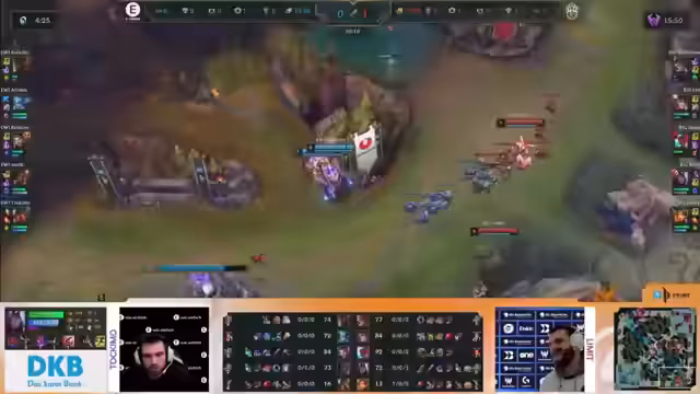 01:07:34Nachdem Mid-Game einsetzt, ist der Goldunterschied auf über 2.500 Gold angewachsen und wächst stetig an. Die Analysten weisen darauf hin, dass EWI die Fähigkeit vermissen lässt, auf dem engen Spielraum noch eine Chance zu wahren. Big hat die gesamte Map-Kontrolle und kann nach Belieben Objektive nehmen. Die Spieler von Big, insbesondere Shelfmade, dominieren die Lanes und tragen durch Solo-Kills und effizientes Farmen entscheidend zum wachsenden Goldvorsprung bei.