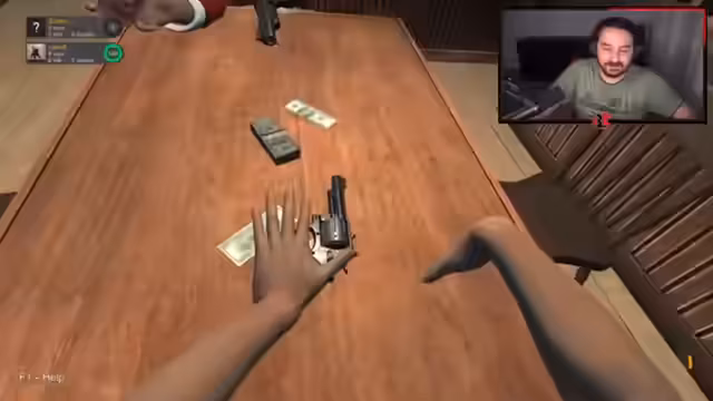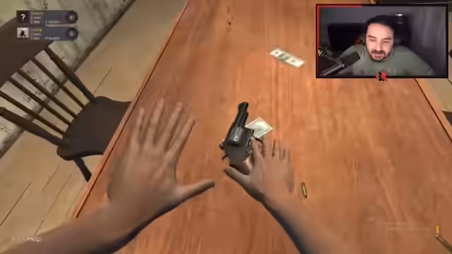 05:49:56Um die monotonen Teile des Spiels zu durchbrechen, schlägt der Streamer eine 'Russische Roulette'-Challenge vor. Das Ziel ist, eine Kugel in eine Waffe zu laden und gegenseitige Schüsse auszutauschen. Der Streamer kämpft jedoch weiterhin massiv mit der ungenügenden Spielsteuerung. Obwohl es ihm gelingt, die Kugel zu laden, kann er die Waffe nicht wie gewünscht halten oder in die richtige Richtung drehen, was die Herausforderung zu einem frustrierenden und witzigen Kampf gegen die Spielmechanik wird.