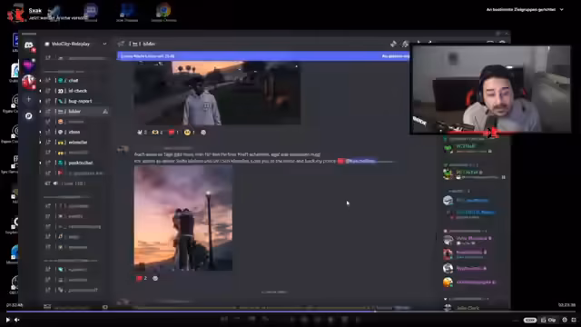 02:25:22Der Stream wechselt zu einer emotionalen anderen Ebene, als er auf tiefgründige Liebesnachrichten in einem Discord-Chat stößt. Charaktere wie Niki Wolf, Vladi und Kuschelbalu tauschen sich über angeblich romantische Gefühle aus. Der Sprecher zweifelt stark daran, dass es sich hierbei nur um reines Roleplay handelt und konstatiert, dass die geschriebenen Texte von echter, tiefer Liebe handeln und emotional sehr stark sind.
