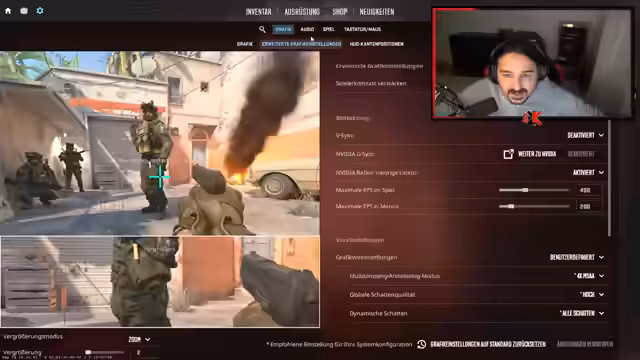 00:53:12Da sich On-Stream-RP als unbrauchbar erwiesen hat, versucht der Streamer Counter-Strike zu spielen. Er muss jedoch erst die richtige Einstellung finden und mit der Steuerung zurechtkommen. Nach einigen Todesfällen und unzufrieden mit seiner Performance testet er verschiedene Empfindlichkeitseinstellungen. Er kritisiert, dass das Spiel zu viele Einstellungsmöglichkeiten biete und für Einsteiger unübersichtlich sei. Gegen Ende der Stream-Session vergleicht er Counter-Strike favorabel mit Velo, weil es keine 'Fähigkeiten' gebe, was das Aiming erleichtere.