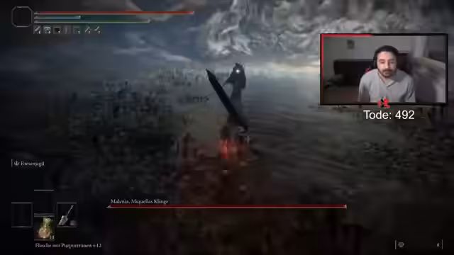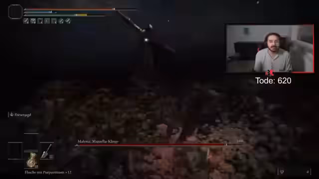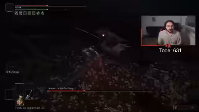 12:24:47Nach fast fünf Stunden Versuchen fasst der Spieler zusammen, dass das Spiel ihn frustriert und die Menschen nur sauer macht. Er beschreibt es als ein "Hurensohn-Game" und "dummes Ubisoft-Game", bei dem man nur gequält wird. Er kündigt an, dieses Spiel nie wieder zu spielen. In seinem letzten Versuch wird er in der zweiten Phase von elf Lebenselixieren des Gegners überrascht und gibt endgültig auf, was als "Schlampe" betitelt wird.