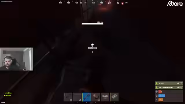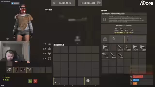 04:34:35Die Spieler diskutieren die Verteilung von gelooteten Gegenständen, insbesondere High Quality Metal (HQM) und Stoff. Sie optimieren die Lagerung in Kisten und bewerten die Verteidigungsfähigkeiten ihrer Base. Es gibt Kritik am fehlenden Schutz durch Spritzen und Werkbank-Levels. Gleichzeitig wird die Koordination für Bootsfahrten und das Säubern von gegnerischen Fundamenten besprochen. Der Fokus liegt darauf, trotz Rückschläge wie verlorenem Rucksack oder Angriffen die Ressourcenbasis zu stabilisieren.