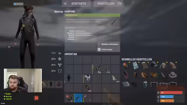 00:02:01Der Streamer konzentriert sich auf das Tauchen, um Ressourcen zu sammeln. Es werden mehrere Tauchsets erwähnt und die Herausforderungen beim Schwimmen in verschiedenen Gebieten wie Labs und Ölquellen beschrieben. Die Konversation dreht sich um die Effektivität von Tauchaktionen und die Notwendigkeit, mehrere Sets zu haben. Es werden auch Begegnungen mit anderen Spielern erwähnt.