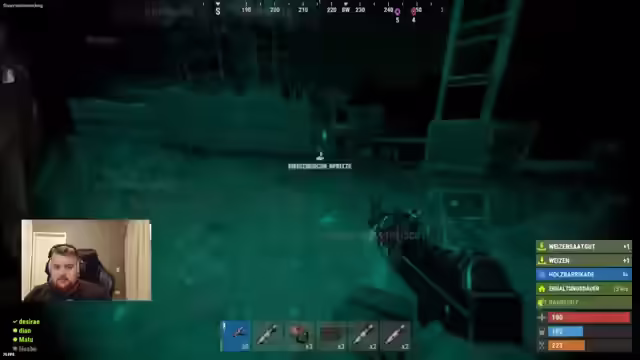 02:48:17Es wird festgestellt, dass fast jede Base online ist. Aufgrund des niedrigen Rates wird überlegt, zum Power Plant zu gehen und die Pumpe mit Diesel zu betreiben. Es wird das Verhalten eines Spielers auf dem Dach kommentiert, der offenbar erst bei Öl aktiv wird. Der Wunsch nach einem Low-Rate-Raid wird geäußert. Es wird sich gefragt, warum das Spiel nur aus Hartz-IV-Empfängern besteht. Ein Teammitglied war vorhin online, musste aber anscheinend gehen. Es wird festgestellt, dass eine Tür nicht geöffnet werden kann, da ein Single-Lock angebracht ist. Die Idee, Berries zu holen und Ts zu machen, wird diskutiert. Es wird beschlossen, eine Base mit 90 Rockets und 24 MLIs anzugreifen, wobei auf Sams Heiz geachtet werden muss. Es wird vermutet, dass die rote Turtles auf dem Duster gemacht werden sollen. Es wird festgestellt, dass Metall nicht decayed, sondern nur Stein. Es wird sich gefragt, ob die Bewohner der Base vergessen haben, etwas zu bauen. Ein Teammitglied soll auf dem Dach bereit sein, während ein anderes die HVs holt. Es wird sich über einen Troll in der Base lustig gemacht. In Fässern über der Dropbox werden Leders gefunden. Es wird vermutet, dass sich Gunpowder in einem Ding befindet. Es wird nach der Menge an Logit im Mini gefragt, um zu entscheiden, ob noch Spritzen gecraftet werden können. Ein Teammitglied soll etwas zu Futter mitnehmen und eine Taschenlampe einpacken.