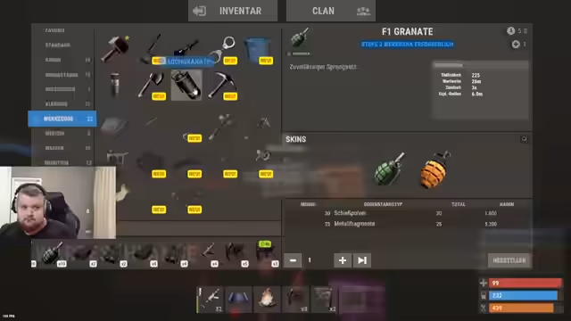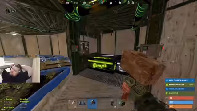 07:15:44Es wird eine Recycling-Tour zum Bergbau-Außenposten geplant. Währenddessen wird eine Basis gesichtet, die Roofcampt. Es werden Serien-Kits gefunden und ein Naked gesichtet. Es wird überlegt, dieses Jahr den Bachelor fertig zu machen. Es wird festgestellt, dass In-Game-Sound durch das Mikrofon übertragen wird. Eine Roofcamper-Base wird entdeckt, was das Recyceln erschwert. Es wird über den Kauf eines neuen Headsets diskutiert, da das aktuelle Probleme verursacht. Es wird über die Wohnsituation gesprochen und wie Freunde die Wohnung betreten können. Es wird überlegt, welche Kits verknüpft werden sollen. Ein Spieler kehrt nach einer Essenspause zurück und berichtet von einem Süppchen. Es wird gefragt, was während der Abwesenheit passiert ist. Es wird diskutiert, ob ein Spass repariert werden kann. Es wird überlegt, ob man so tun soll, als ob man ein Gegner ist, um ein neues Team zu bekommen. Es wird festgestellt, dass bestimmte Spieler nicht mehr weiter spielen oder umgezogen sind. Es wird über die Stärke von Geist-Peaks diskutiert. Es wird festgestellt, dass der Server leer ist. Eine coole Base mit Open Core wird gesichtet. Es wird vorgeschlagen, die Grubs zu raiden, die die ganze Zeit nerven. Ein Spieler kommt nicht mehr aus einer Basis heraus und ein TC wird entdeckt, der aber schon weg ist. Es werden Koordinaten ausgetauscht und eine weitere Base gesichtet. Es wird festgestellt, dass die Base gelieft ist. Ein Spieler stirbt und ein anderer macht die Tür auf. Es wird festgestellt, dass die Basis gelockt ist und Satchels platziert werden. Ein Spieler wird angerufen und legt auf. Ein Spieler versucht, Backs mit einem Hammer wegzumachen und benötigt einen Schlafsack. Ein Spieler wird in der Basis eingesperrt und versucht, freigelassen zu werden. Die Basis wird als dumm bezeichnet und es wird beschlossen, nicht in sie einzubrechen. Ein Spieler wird als Männerhasser bezeichnet. Es werden Bags und ein Bettchen aufgehoben. Es wird festgestellt, dass kein Rucksack vorhanden ist und um Hilfe gebeten, um aus der Basis zu gelangen. Es wird nach Shotgun Club mit Ammo gefragt. Ein Backpack wird nach oben gebracht und vollgesaugt. Es wird sich gewundert, warum die ganze Base offen war. Es wird vermutet, dass die Base verschenkt wurde. Ein Spieler bittet darum, die Tür zu öffnen, um die Basis zu verlassen. Es wird alles zum Haken mitgenommen. Es wird festgestellt, dass es viele Farben gibt und ein Jacky vorhanden ist. Ein Spieler stellt fest, dass die Aufhebung kaputt ist.