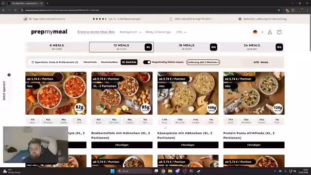 07:39:26Der Streamer bewirbt aktiv sein Food-Unternehmen Muckis. Er preist deren Protein-Mittagessen an, die als leckerer und günstiger Ersatz für Döner gelten. Es werden konkrete Produkte wie Kürbis-Spätzle und Alfredo-Sauce empfohlen. Als Partnerschaft wird erwähnt, dass das Unternehmen auch für die Bereitstellung von Getränken und Snacks bei der Gamescom verantwortlich war.